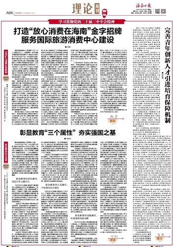 国际旅游消费中心是海南“三区一中心”战略定位之一,创建国际一流的消费环境是国际旅游消费中心建设的必要内容。《中共中央关于进一步全面深化改革、推进中国式现代化的决定》明确,完善扩大消费长效机制,减少限制性措施,合理增加公共消费,积极推进首发经济。近年来,海南省市场监管局坚决贯彻党的二十大和党的二十届二中、三中全会以及省委八届四次、五次全会精神,认真落实省委、省政府决策部署,坚持“放心消费在海南”活动与“守护消费”专项行动双轮驱动,着力打造安全放心的消费环境,全力服务国际旅游消费中心建设。