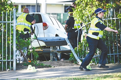 图为警察在澳大利亚墨尔本汽车冲入校园事件现场工作。新华社/美联