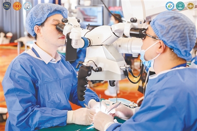 胡朝波(左)带队参加全国超级显微外科血管吻合技能大赛。医院供图