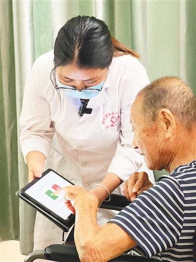 儋州市那大镇卫生院,一名护士指导老人做认知康复数字疗法训练。