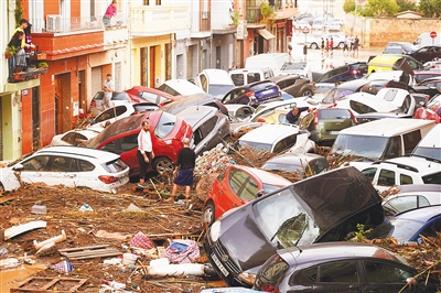 10月30日,人们在西班牙巴伦西亚查看被洪水损毁的汽车。