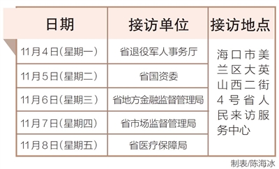 11月4日至8日,省退役军人事务厅、省国资委、省地方金融监督管理局、省市场监督管理局、省医疗保障局相关负责人将在海口市美兰区大英山西二街4号省人民来访服务中心接访群众。