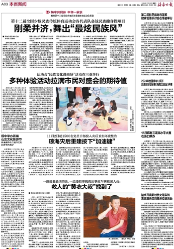 本报三亚11月2日电(海南日报全媒体记者黄媛艳 海报集团全媒体记者刘子榕)11月2日,第十二届全国少数民族传统体育运动会(以下简称运动会)“民族文化进商场”活动在三亚天悦城举行。现场设置运动会特许商品展售、比赛项目体验、非遗手工体验、黎锦技艺展示等丰富多彩的活动,吸引众多市民游客参与,营造全民迎盛会的良好氛围。活动现场设置运动会展示区,放置运动会打卡装置和竞赛项目介绍等装饰物,市民游客扫描小程序码即可参与运动会数字火炬手传递,还可在祝福墙上写下对盛会的祝福。此外,现场还设有运动会特许商品售卖区,展示和售卖盛会特许商品。