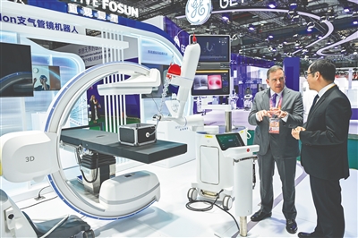 11月5日,参会者在第七届进博会医疗器械及医药保健展区直观复星展台了解一款支气管镜机器人。