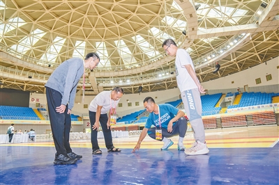 11月8日,在三亚技师学院体育馆,运动会珍珠球场地管理员王狮(右二)与同事在检查运动场地地面。海南日报全媒体记者 李天平 摄