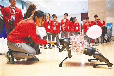 志愿者在新闻中心与机器狗握手告别。