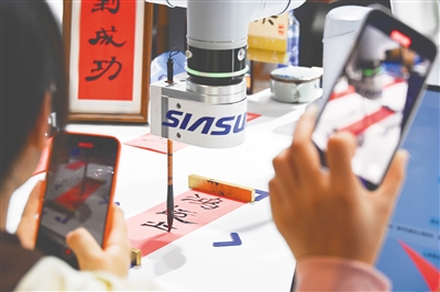 参观者在第七届进博会上拍摄机器人写书法。