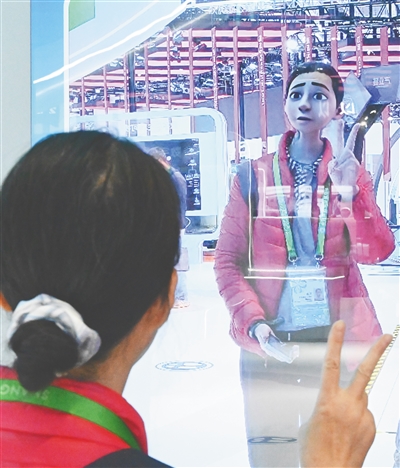一名参观者在第七届进博会上体验卡通人物自拍。