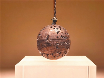 唐代以后,随着金银器铸造工艺的进步,球形香囊成为当时香具的代表性器具。从造型上看,球形香囊通常呈圆球状,外有长链,球体镂空,分上下两半,以铆接的叶片状卡榫连接。至于其内部的设计,则十分精妙。据田艺蘅在《留青日札》中记载:“今镀金香毬,如浑天仪然,其中三层关,轻重适均,圆转不已,置之被中,而火不复灭,其外花卉玲珑,而篆烟四出。”这里说的“香毬”,就是唐宋时期的球形香囊。在重力和活动机环的作用下,无论外层球体怎样转动,球形香囊内层的半圆形香盂总能保持平衡状态,就像地球仪一样稳定。如此一来,不但火星不会外漏,燃尽的香灰也不会洒出。