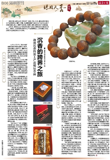 近年来,海南各企业不断延伸沉香产业链,创意性地对沉香进行深加工。据统计,目前海南沉香的加工产品有熏香品、工艺收藏品、药品、沉香日化品等四类共200多种。