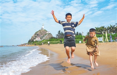 11月10日,东方市鱼鳞洲风景区天气晴朗,小游客在海边嬉戏。冬季来临,该景区凭借着温暖的气候条件和美丽的滨海风光,吸引各地“候鸟”和游客前来游玩。海南日报全媒体记者 陈元才 摄
