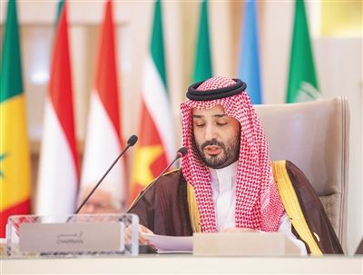 沙特阿拉伯王储穆罕默德·本·萨勒曼在阿拉伯-伊斯兰国家特别峰会上讲话。新华社发
