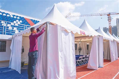 11月14日,在西南大学三亚中学运动场,工作人员正在搭建帐篷。