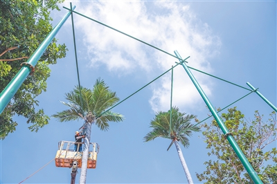 11月14日,在西南大学三亚中学运动场,运动会攀椰竞速场地布置工作加紧开展。图为工人在粉刷用于攀椰竞速的“椰子树”。