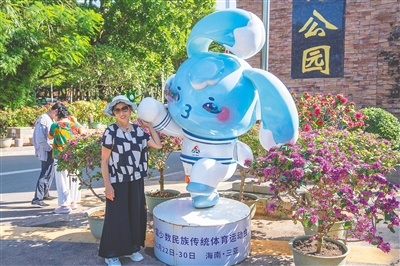 11月14日,在三亚临春岭森林公园门口,一位游客与运动会吉祥物“吉贝”合影。