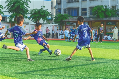 11月13日,海口市英才小学校园足球联赛二年级组开赛,学生们在绿茵场上来回奔跑,运球、过人、射门一气呵成。据了解,该校足球联赛本着“以赛促训”的原则,旨在让孩子们领略足球的乐趣,营造浓郁的校园足球文化氛围,助力学生身心健康发展。