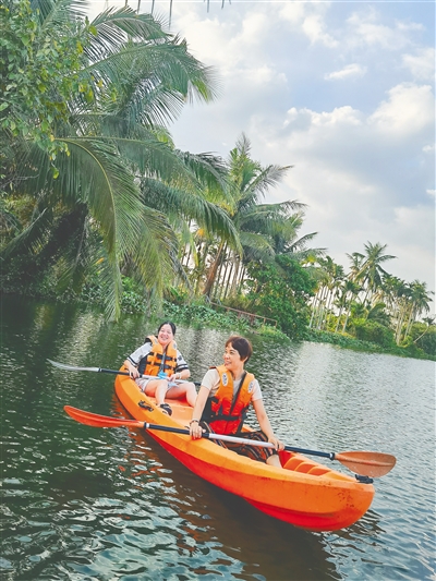 林鹰曾是国家队桨板教练出身,返乡创业后成立了琼海嘉积鸭溜户外运动基地。依托万泉河的地理优势,他将桨板运动“搬”到了这片水域上,“和千篇一律的看海相比,划着桨板穿梭在具有亚马逊风格的河道上,别具一番风味。”