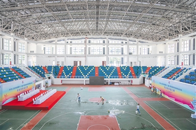 近日,在西南大学三亚中学体育馆内,工作人员正在打扫运动会民族健身操竞赛场馆。