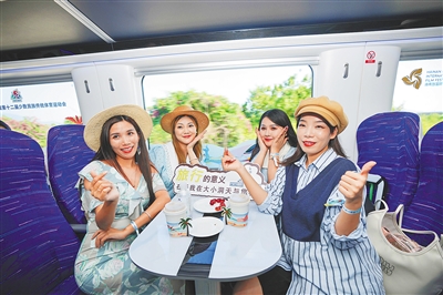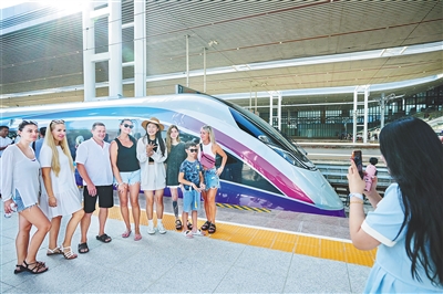 中外游客在动车前合影留念。 本组图片均由海南日报全媒体记者 王程龙 摄
