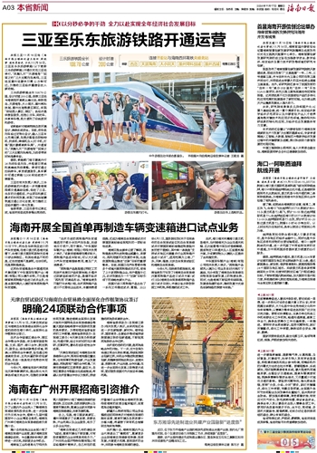 本报三亚11月16日电 (海南日报全媒体记者王栋田 周晓梦 通讯员徐武 方杰)11月16日,三亚至乐东旅游铁路(以下简称三乐旅游铁路)开通仪式在三亚站举行。“凤舞九天”“天涯海角”“回首之约”三大主题列车亮相,三亚站至崖州站最快只需32分钟可达,为推动三亚经济圈建设注入新动能。三乐旅游铁路全长108.78公里,设计时速200公里,连接三亚站与海南西环高铁尖峰北站,串联西岛、天涯海角、大小洞天、崖州湾科技城、崖州古城等景区园区,实现“到站即入景区、园区”。各站点提供接驳服务,包括公交车、网约车、共享单车等,极大便利了沿线居民和游客。