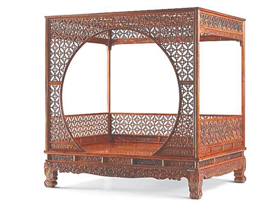 明式海南黄花梨四簇如意云纹月洞门架子床。