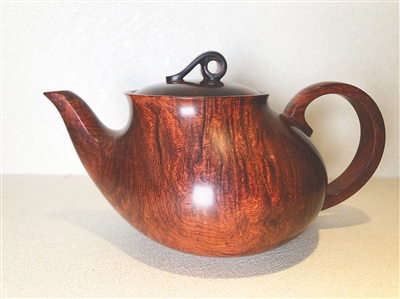 该茶壶采用海南白沙黄花梨,质感细腻。