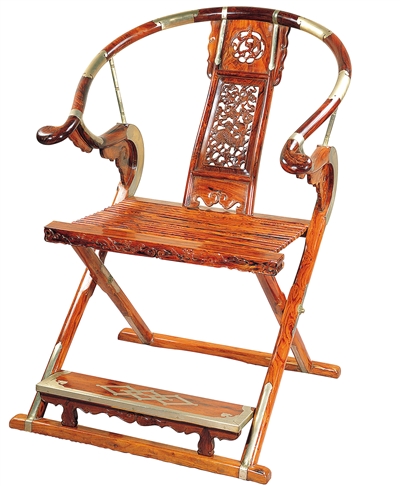 交椅,因椅足呈交叉状而得名,可折叠,携带较为方便。在古代,坐交椅往往象征着坐者的身份、地位高,后来人们用“坐第一把交椅”来形容一群人当中的首领。上海博物馆收藏的明代黄花梨圆后背交椅,为我国文物专家、收藏家王世襄旧藏。此交椅造型优美、工艺精湛,靠板上部有螭纹,中间雕刻麒麟、山石、灵芝,下部雕刻卷草纹。交椅构件的交接处镶有铜饰件,兼顾实用与美观。