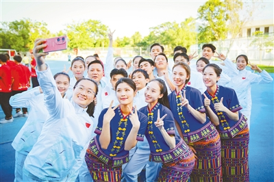 海南代表团运动员身穿团服、民族服饰合影留念。 海南日报全媒体记者 王程龙 摄
