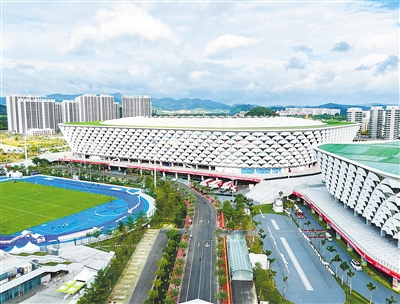 2021年9月15日,体育场完工,北京城建六集团用不到两年的时间,完成了海南省规模最大、标准最高体育场的设计和施工任务。