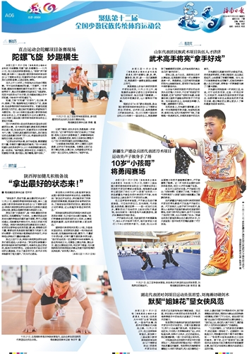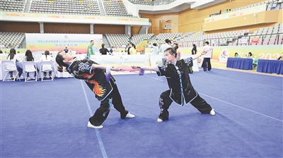 对剑是运动会民族武术项目中的对练项目之一,两名运动员的配合对这一项目的完成质量至关重要。张思雯和刘海燕都有着超过10年的习武经历,两人成为搭档这一年来,从最初在练习中常误伤对方,到不断调整各自的招式,再到如今磨合出攻防转换间的默契,可谓下了不少功夫。彼此间的“团魂”也让她们对即将到来的比赛充满信心。“我们站上去,旁边的人就不存在了,真的像两个人在竹林间切磋剑术!”刘海燕说。