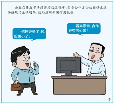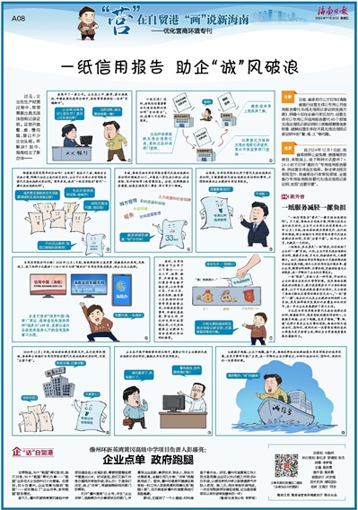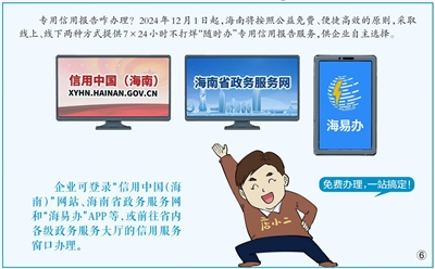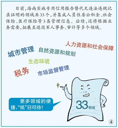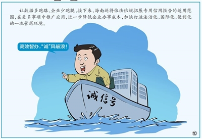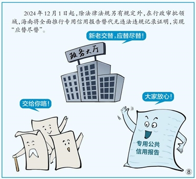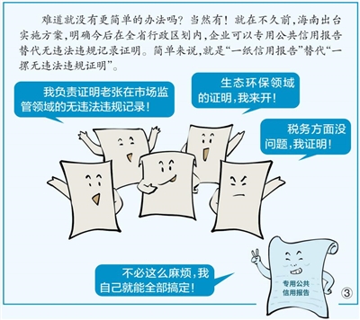 “一纸信用报告”替代“一摞无违法违规证明”。不久前,海南出台实施方案,明确今后在全省行政区划内,企业可以专用公共信用报告;今年12月1日起,除法律法规另有规定外,在行政审批领域,将全面推行专用信用报告替代无违法违规记录证明,实现“应替尽替”。这对企业而言,无疑是一大利好。