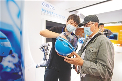 阿里巴巴公司展台的工作人员向观众讲解智能头盔的工作原理。新华社发