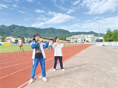 除了组建队伍,三亚市民族中学还将射弩、陀螺、攀椰、高脚竞速、板鞋竞速等少数民族传统体育项目引入体育课堂和大课间活动,不断丰富校园体育的“菜单”,使之更生动、更活泼、更有特色,形成良好的体育氛围。