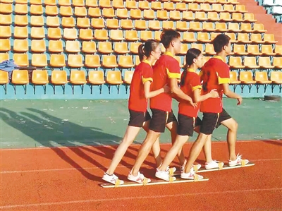 三亚市民族中学学生练习板鞋竞速。