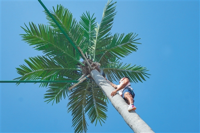 参加第十二届全国少数民族传统体育运动会攀椰竞速项目的选手正加紧训练。海报集团全媒体记者 王程龙 摄