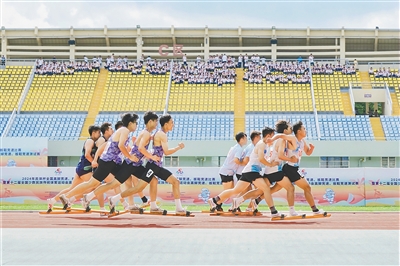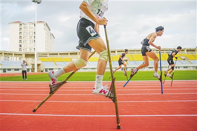 海南省第七届少数民族传统体育运动会高脚竞速比赛现场。