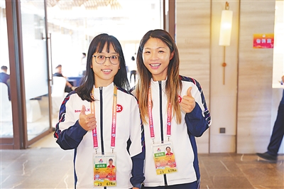 香港代表团龙舟项目运动员黄羲汶(左)、蔡菲玉(右)。