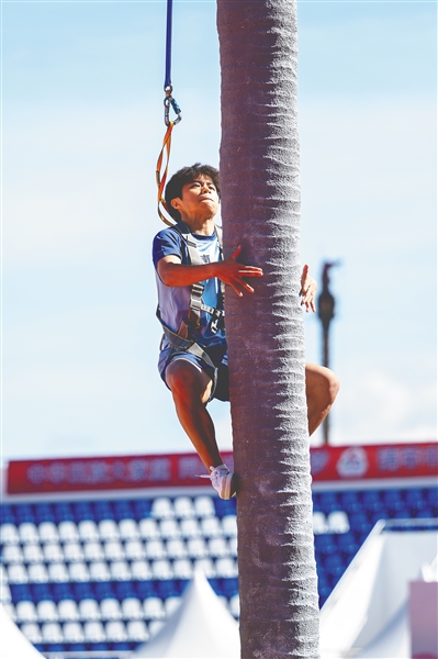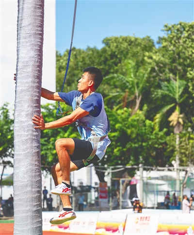 本报三亚11月24日电 (海报集团全媒体记者张琬茜 利声富)11月24日上午,第十二届全国少数民族传统体育运动会海南代表团再获佳绩——海南代表团运动员罗军、符诗军分别包揽攀椰竞速项目男子9米决赛、女子7米决赛一等奖。作为本届运动会新增竞赛项目,攀椰竞速自开赛以来就广受关注,赛场上的“速度与激情”引起连连喝彩。