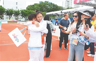 海南代表团运动员符诗军(左一)和广西代表团运动员韦姬华在赛后相拥。