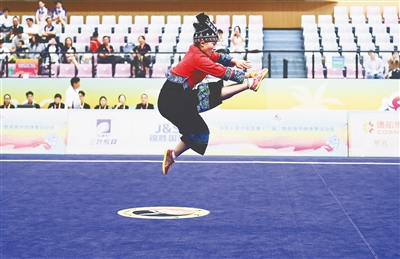 赛场上,另一个很有特色的表演同样来自海南代表团,19岁的运动员王砚茜带来的黎家拳。上场时,不同于其他选手的装扮,王砚茜穿了一套民族服装,打起拳来衣服上的银铃叮当作响,多了一份黎家姑娘的灵动。
