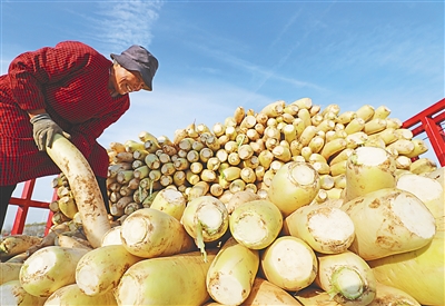 图为11月22日,在山东省临沂市郯城县郯城街道一处蔬菜种植基地,农民在整理装运采收的订单白萝卜。新华社发