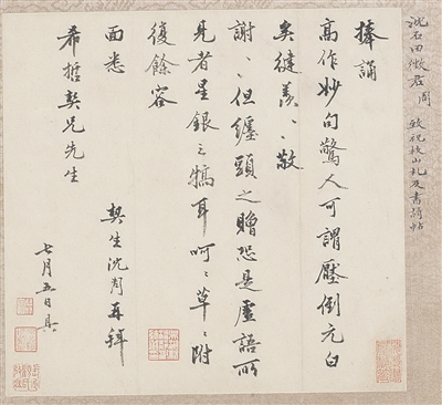 上海博物馆2017年举办的“遗我双鲤鱼”明代吴门书画家书札展,展出了一件书法作品——沈周《致祝允明札》,读罢这封信札,让人觉得颇为有趣。信札大意为:捧读了您的大作,妙句令人惊叹,其水平简直可以说超过了唐代的大诗人元稹和白居易啊,真是太羡慕了;但“缠头之赠恐是虚语”,才给你这么一丁点酬劳,我只能“呵呵”一笑了。在信札中,沈周对后辈祝允明的新诗评价极高,赞不绝口,甚至将其与唐代的大诗人作比较,语言随性诙谐。在提到酬劳时,他用一个接地气的“呵呵”抵去了尴尬。在古代,“缠头之赠”一般指艺人表演结束后,邀请方或观众给艺人的礼物或酬劳,后泛指各类酬劳。笔者推测,沈周所说的“缠头之赠”,应是请托祝允明写诗随信寄付的稿酬。