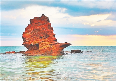亲眼见到那块呈红褐色,充满阳刚之气,高出海面数十米与众不同的巨礁。我才真正体会到这个民间故事充满了丰富的想象力。真的,从远处看,它像一把犁头,从近处看,它像一艘将要扬帆起航的船。近前正面看,它更像是一只展翅欲飞的大鹏,难怪有人称之为“帆船石”,也有人称之为“大鹏展翅”。