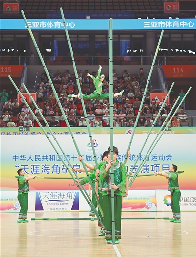 11月27日,在三亚市体育中心,第十二届全国少数民族传统体育运动会表演项目上,广东代表队带来了《同心共“竹”中国梦》。