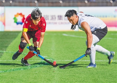 11月27日,第十二届全国少数民族传统体育运动会木球项目淘汰赛中,河北队和海南队运动员展开拼抢。