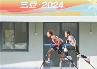 十一月二十八日,海南队选手姚孟江(左)在第十二届全国少数民族传统体育运动会高脚竞速男子200米决赛中。