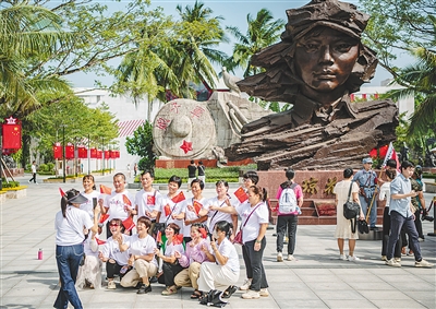 热闹的场景同样出现在红色娘子军纪念园。纪念园里,有的游客听着讲解了解红色娘子军的故事,也有的游客在纪念园里合影留念。