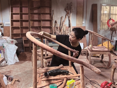 “南海工匠”周凤姣在拼装黄花梨圈椅。(周凤姣供图)