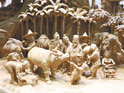 国家高级技师胡敬阳携木雕作品《苏东坡在儋州》参展。海南日报全媒体记者 周达延 摄