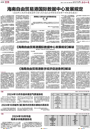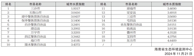 按照《地表水环境质量标准》(GB3838-2002)、《地表水环境质量评价办法(试行)》(环办〔2011〕22号)和《城市地表水环境质量排名技术规定(试行)》(环办监测〔2017〕51号)等评价,2024年1月~10月,全省地表水总体水质为优,监测的193个断面(点位)中:水质优良(Ⅰ~Ⅲ类)断面(点位)占96.9%,无劣V类断面。19个市县水环境质量按由好至差排名分别为:三沙市、五指山市、琼中黎族苗族自治县、保亭黎族苗族自治县、白沙黎族自治县、澄迈县、万宁市、昌江黎族自治县、海口市、陵水黎族自治县、琼海市、定安县、三亚市、屯昌县、乐东黎族自治县、临高县、儋州市、文昌市和东方市。详见右表: